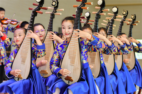 Pupils perform pipa, a four-stringed Chinese lute, at a primary school in Hefei city, Anhui province on May 31, 2022. [Photo by Yuan Bing/for chinadaily.com.cn]