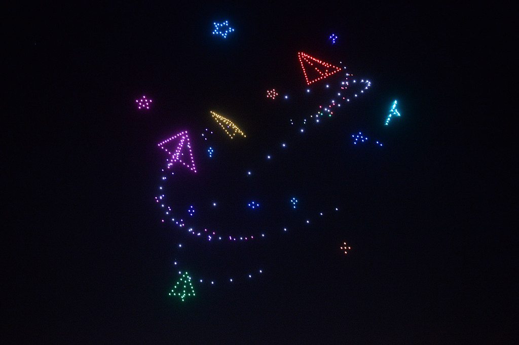 Unmanned drones create images of paper planes and light up the sky in Binhai New Area, Tianjin. [Photo/VCG]