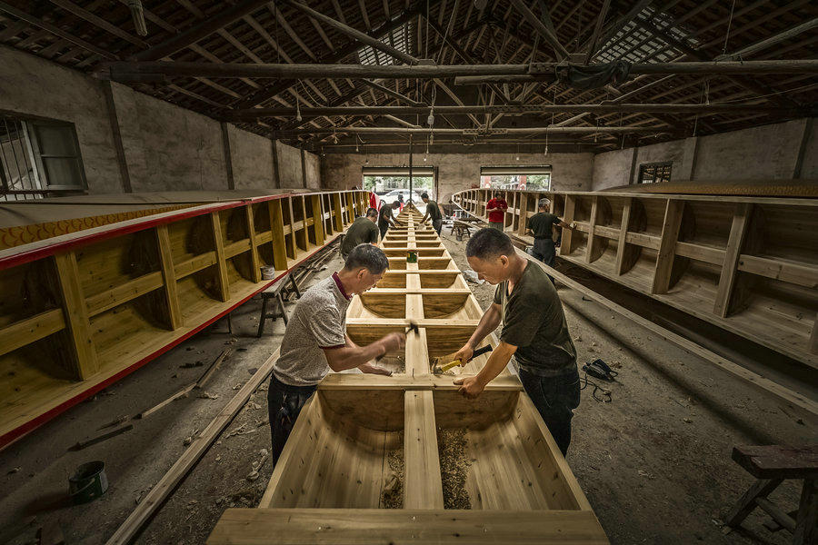 Craftsmen make a wooden dragon boat in Miluo, Hunan province. [Photo by Deng Shugang/Provided to chinadaily.com.cn]