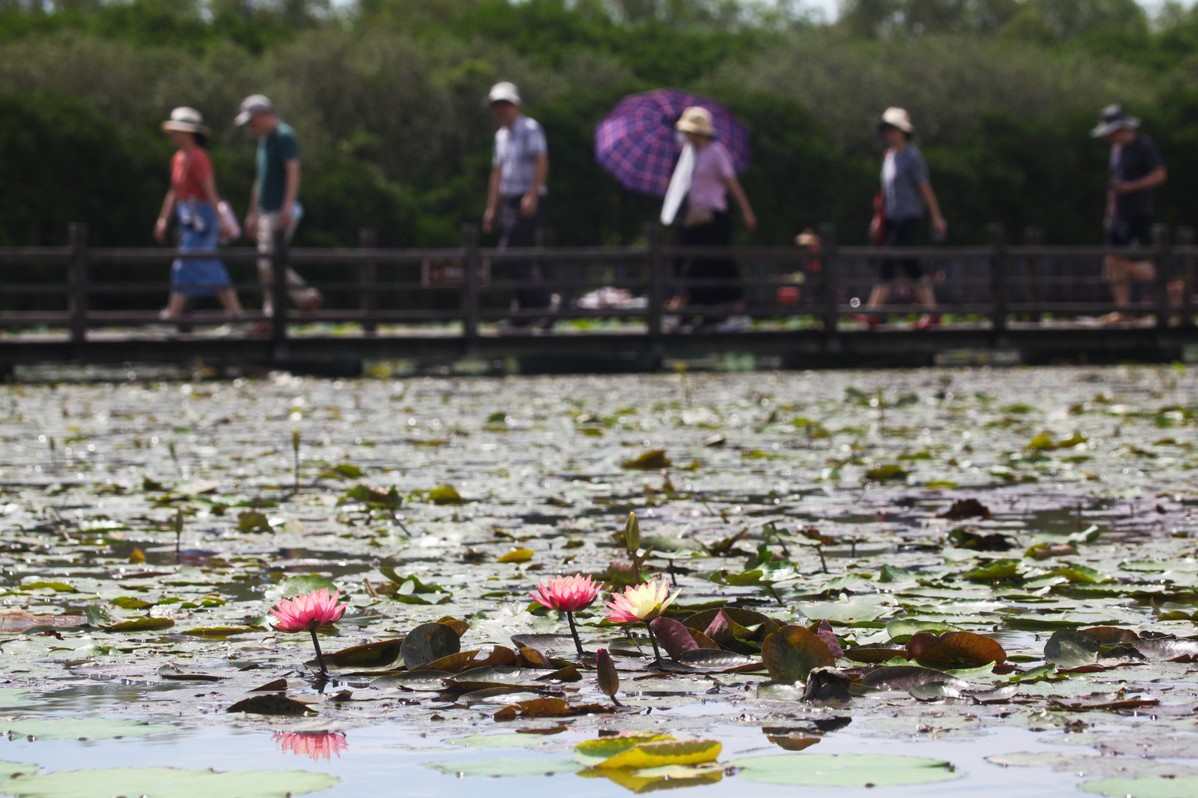 Blooming double-colored water lilies draw visitors to the Nansha Wetland Park in Guangzhou, South China’s Guangdong province. [Photo provided to chinaservicesinfo.com]