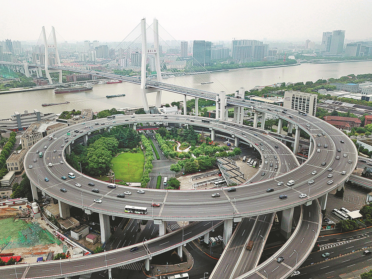A bird's-eye view of the Nanpu Bridge in Shanghai after the lockdown was lifted. [Photo by Gao Erqiang/China Daily]