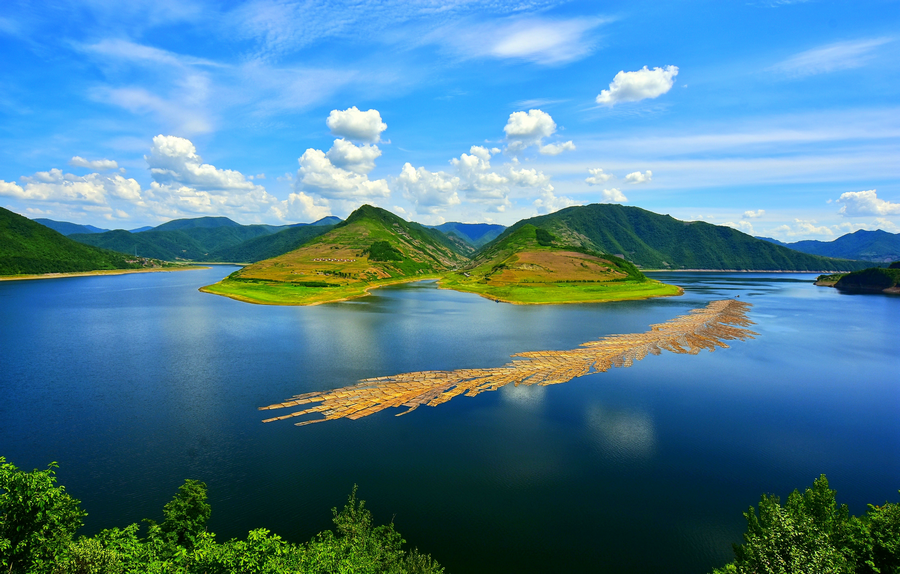 As summer begins, a group of workers has assembled tree trunks to create a long raft and are floating down the Yalu River in Jilin province to revive the ancient tradition of timber floating.