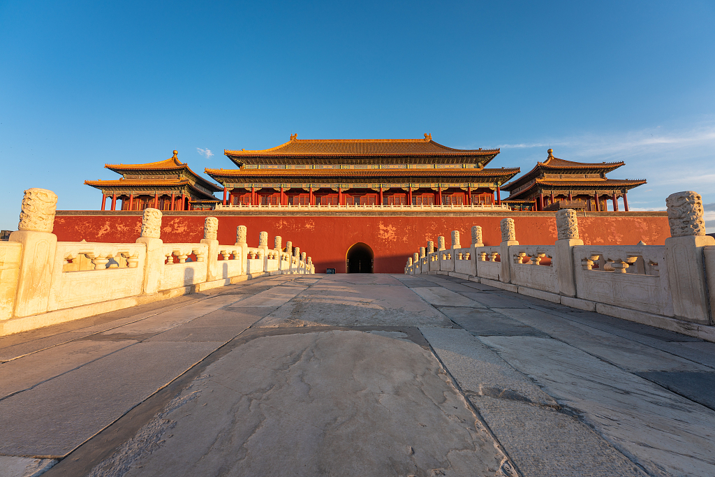 At sunset, the Meridian Gate (Wu men) of the Forbidden City is reflected in the Inner Golden Water River (Nei Jinshui he) in Beijing, creating a magnificent view.