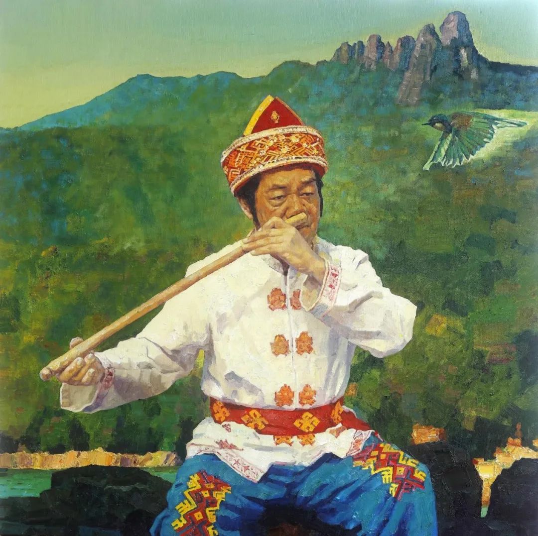 An oil painting by Fu Jiazhen (符嘉臻) presents a Li man playing the nose flute. [Photo/Official WeChat account of the Hainan Museum]