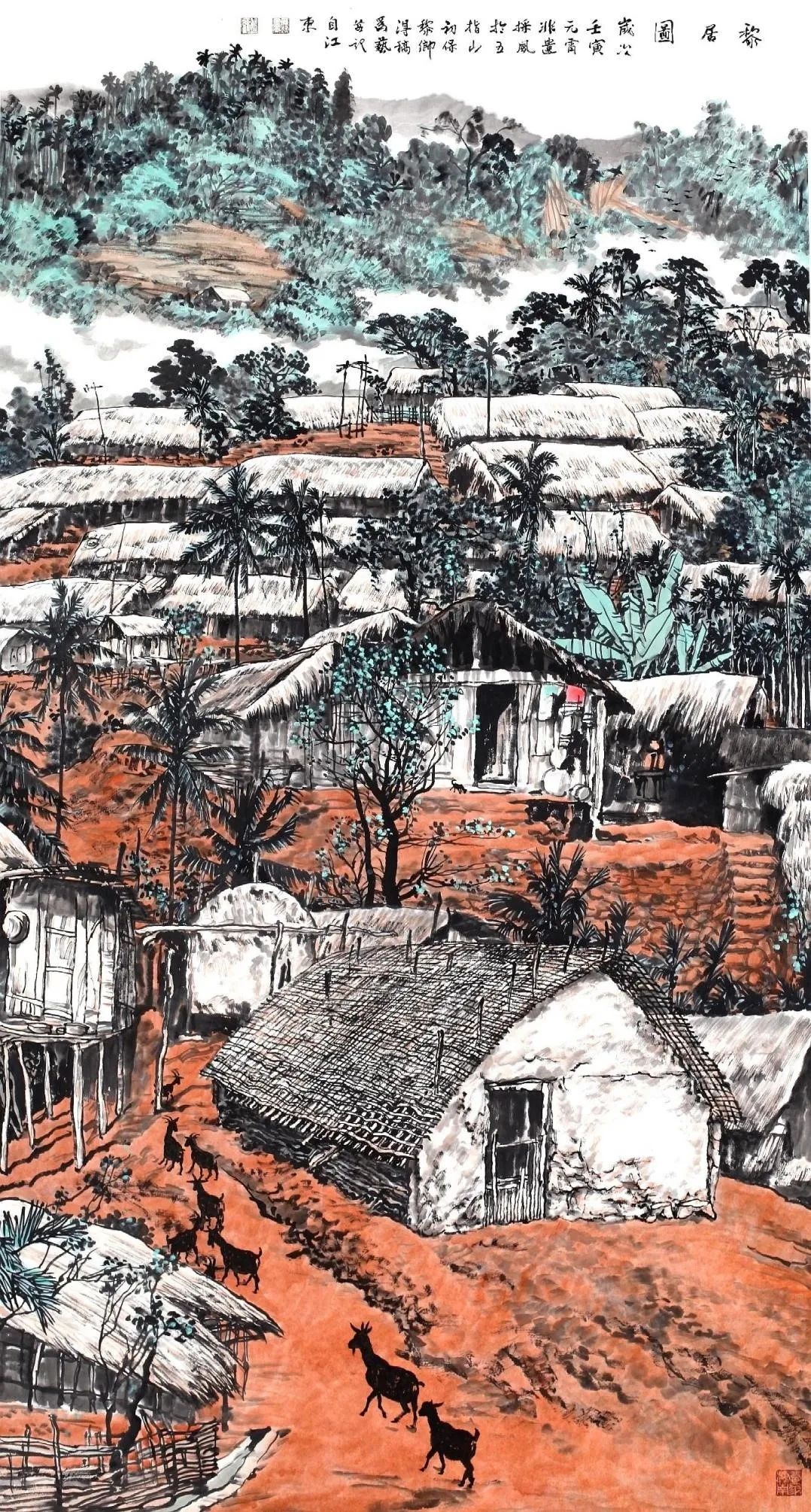 An ink-and-color painting by Xu Weiyi (许为艺) depicts houses of Li people. [Photo/Official WeChat account of the Hainan Museum]
