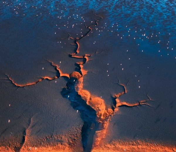 When the water plant Suaeda Salsa turned red at the mouth of a river in September 2019, Guan took an aerial photo. The winding beach was like the branches of a tree, the blue sea like a tree canopy. A flock of birds flew by to give life to the image.