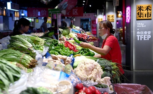 A customer buys vegetables at Jihua3511 Cultural Innovation Science Park in Xi'an, Northwest China's Shaanxi province, on May 20. [Photo/Xinhua]