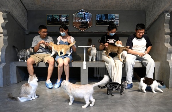 People interact with cats at Jihua3511 Cultural Innovation Science Park in Xi'an, Northwest China's Shaanxi province, on May 20. [Photo/Xinhua]