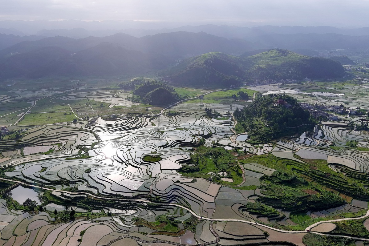 Rice paddies present striking summer pastoral views in Wantanhe town and Daxin village of Longli county, Guizhou province. [Photo by Long Yi/Provided to chinadaily.com.cn]