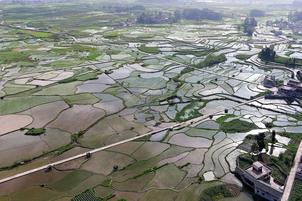 Rice paddies present striking summer pastoral views in Wantanhe town and Daxin village of Longli county, Guizhou province. [Photo by Long Yi/Provided to chinadaily.com.cn]