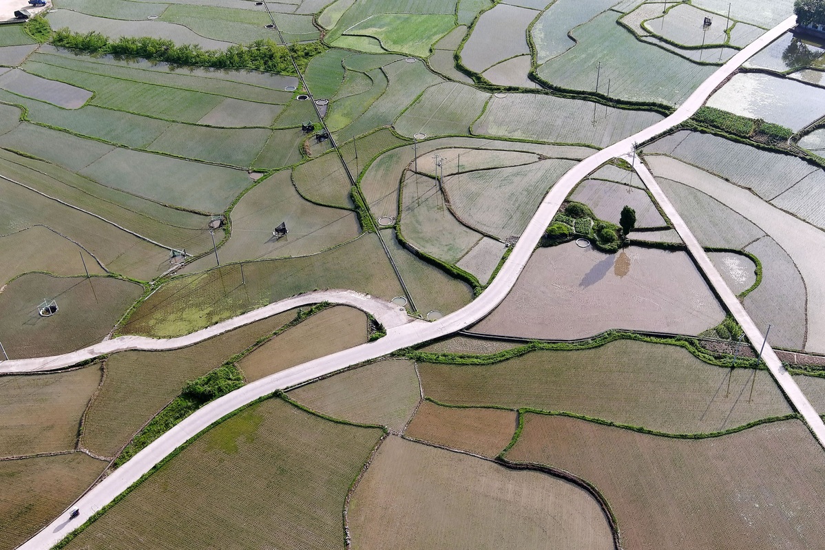 Rice paddies present striking summer pastoral views in Wantanhe town and Daxin village of Longli county, Guizhou province. [Photo by Long Yi/Provided to chinadaily.com.cn]