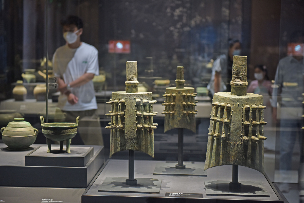 Visitors view pieces of bronze ware at the Anhui Chu Culture Museum. [Photo/VCG]