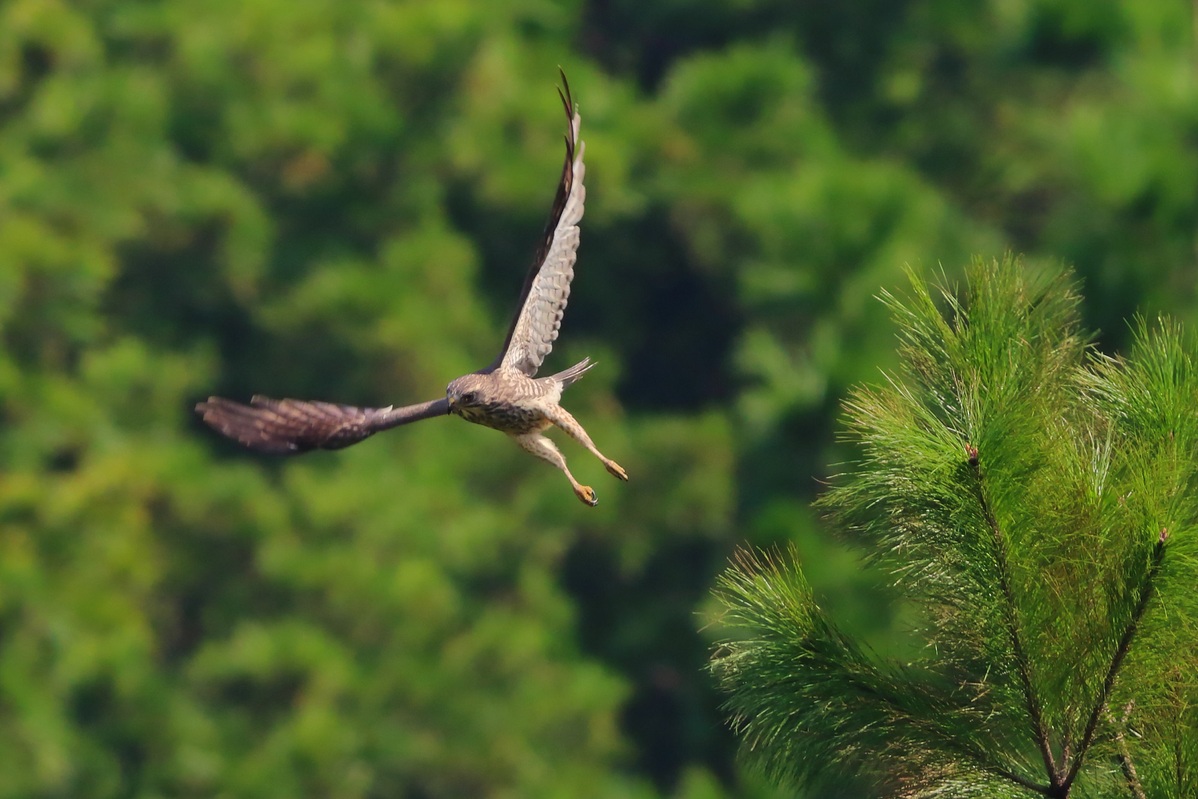 Photo shows a grey-faced buzzard eagle flying down from a tree in the Hengshan Mountain. [Photo by Kuang Daiyong/For chinadaily.com.cn]