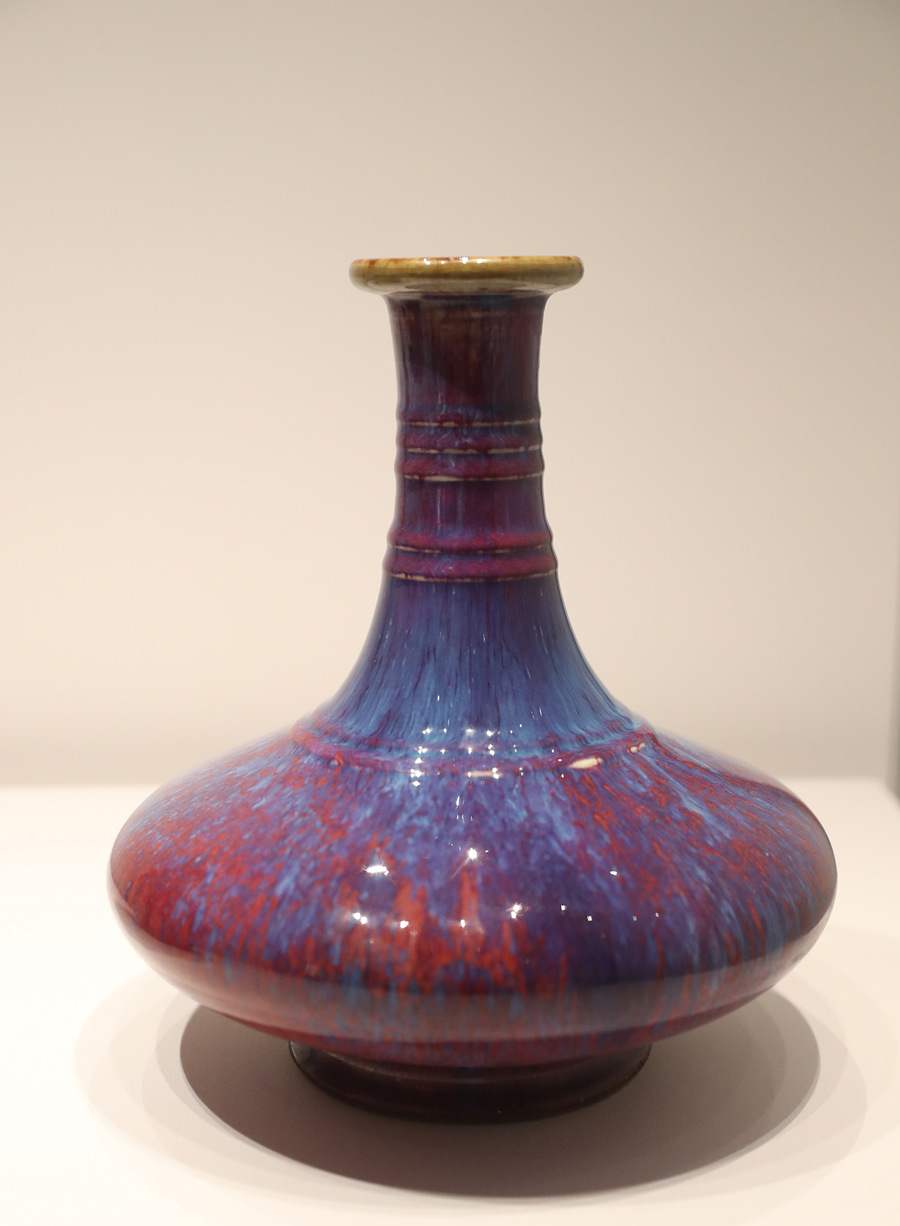 A fambe glazed vase with string patterns from the Yongzheng Period of the Qing Dynasty will be on display at the opening exhibition of the Hong Kong Palace Museum. [Photo by Zou Hong/China Daily]