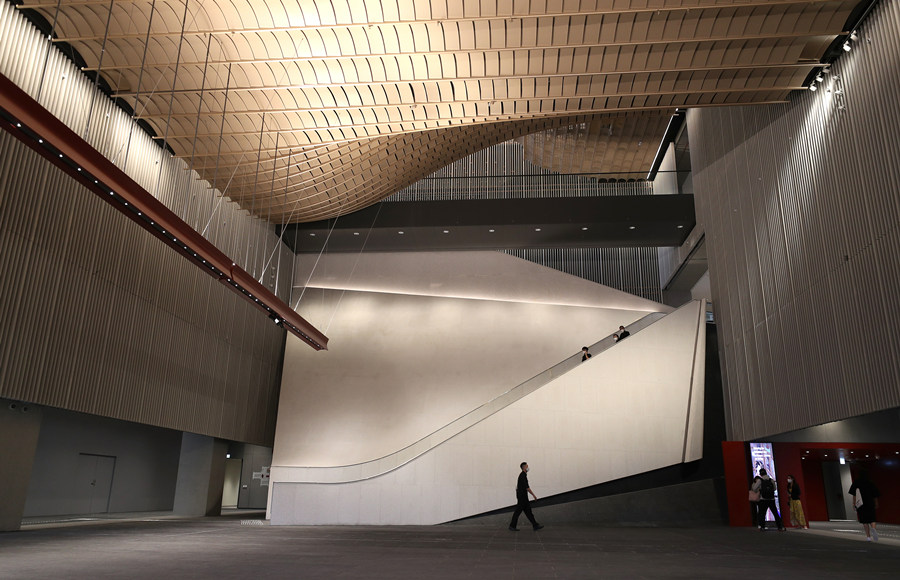 The ceilings in the Hong Kong Palace Museum present a modern interpretation of glazed tiles used on the roof of the Palace Museum in Beijing. [Photo by Zou Hong/China Daily]