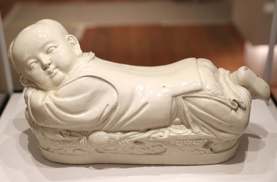 A white glazed baby pillow from the Ding Kiln in the Northern Song Dynasty will be on display at the opening exhibition of the Hong Kong Palace Museum. [Photo by Zou Hong/China Daily]