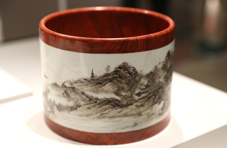 A faux wood grain glazed brush pot with ink landscape painting from the Yongzheng Period of the Qing Dynasty (1644-1911) will be on display at the opening exhibition of the Hong Kong Palace Museum. [Photo by Zou Hong/China Daily]