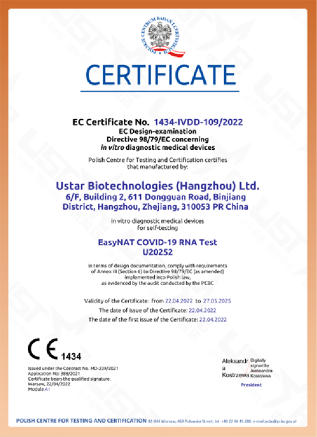The CE certificate issued by the European Union for Ustar Biotechnologies (Hangzhou) Ltd for its in vitro diagnostic medical devices. [Photo/bioustar.com]