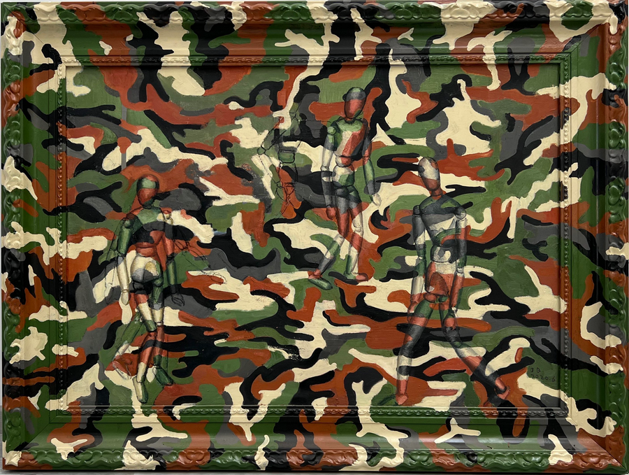 Chinese artist Xing Junqin is known for using camouflage in his mixed-media works, by which he expresses the theme of peace.