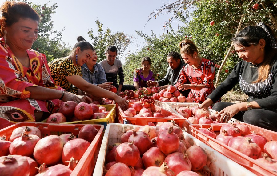 Villagers pick pomegranates in Qira town of Qira county in Hotan prefecture, Northwest China's Xinjiang Uygur autonomous region, on Oct 1, 2021. [Photo/Xinhua]
