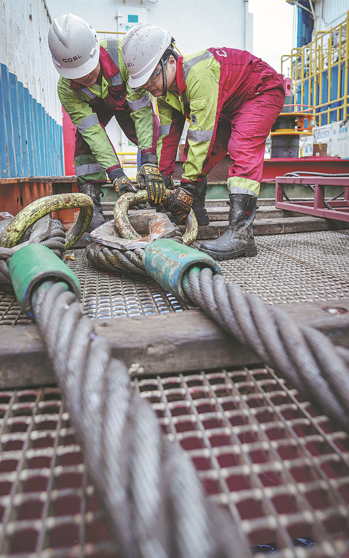 Two technicians try to move a 1-metric-ton iron cable that is chained to the subsea Christmas tree. ZHANG MAO/FOR CHINA DAILY
