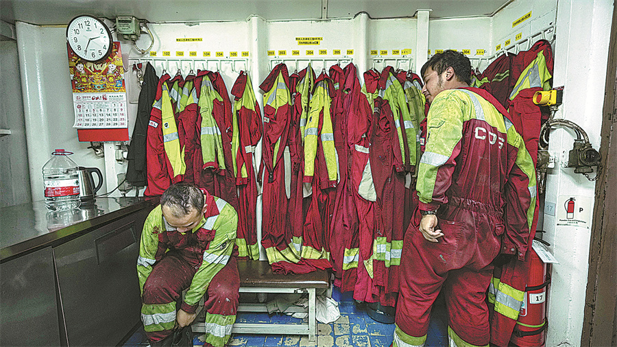 Two workers change uniforms in a cabin. Working in a hot, salty and humid environment, they change uniforms five times a day. ZHANG MAO/FOR CHINA DAILY