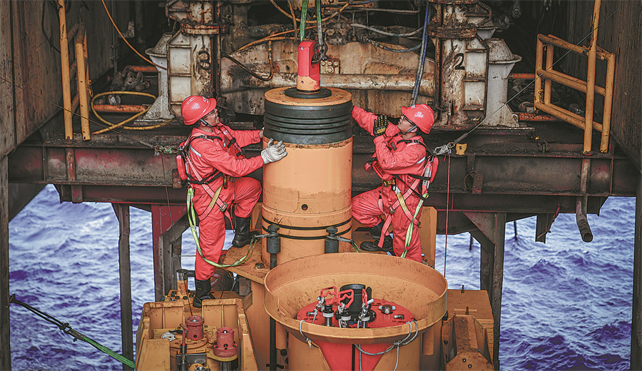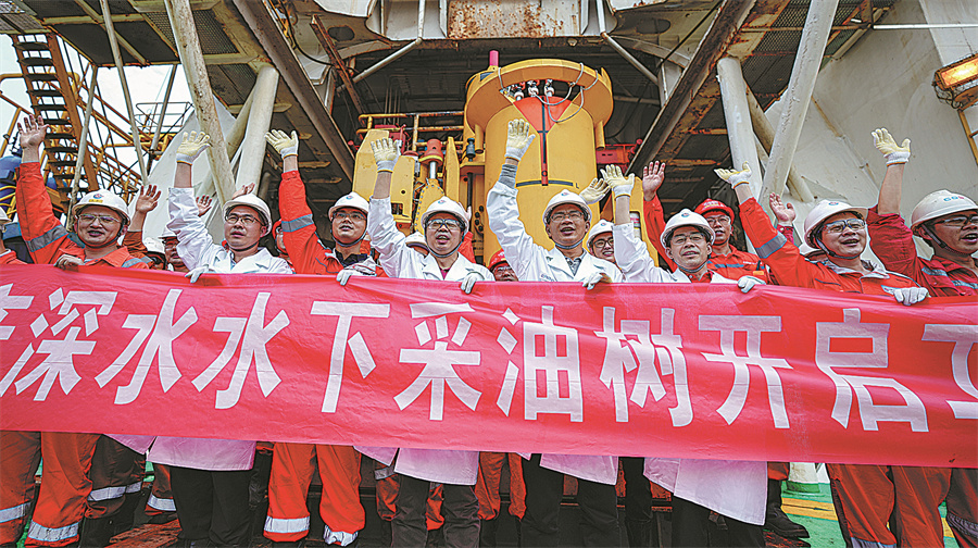 Engineers make final checks on the wet tree before it is assembled in deep water. ZHANG MAO/FOR CHINA DAILY