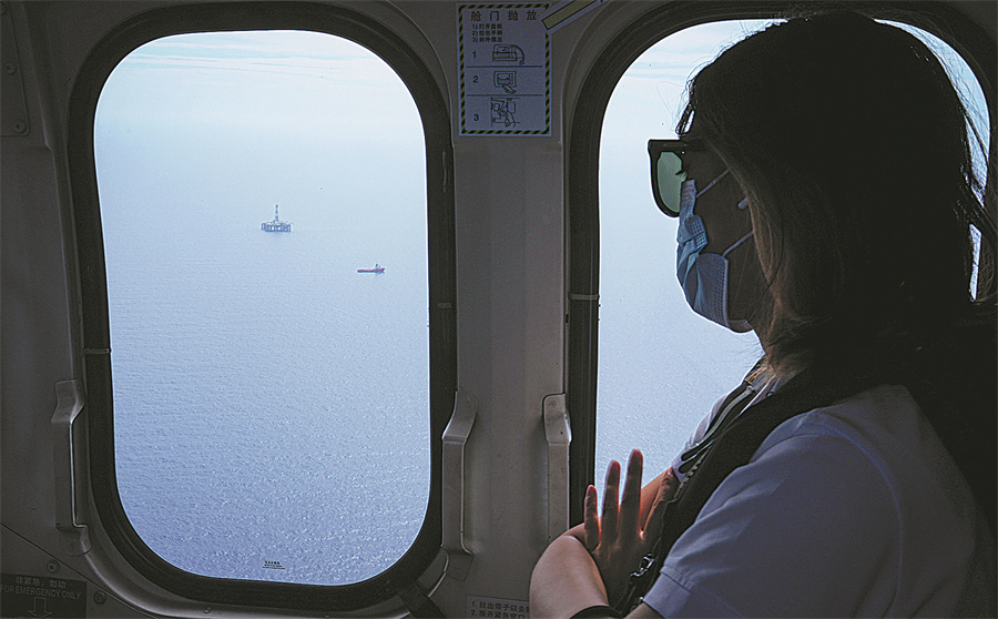 From the helicopter, one can see the Nanhai No 7 drilling platform and a tender ship. ZHANG MAO/FOR CHINA DAILY