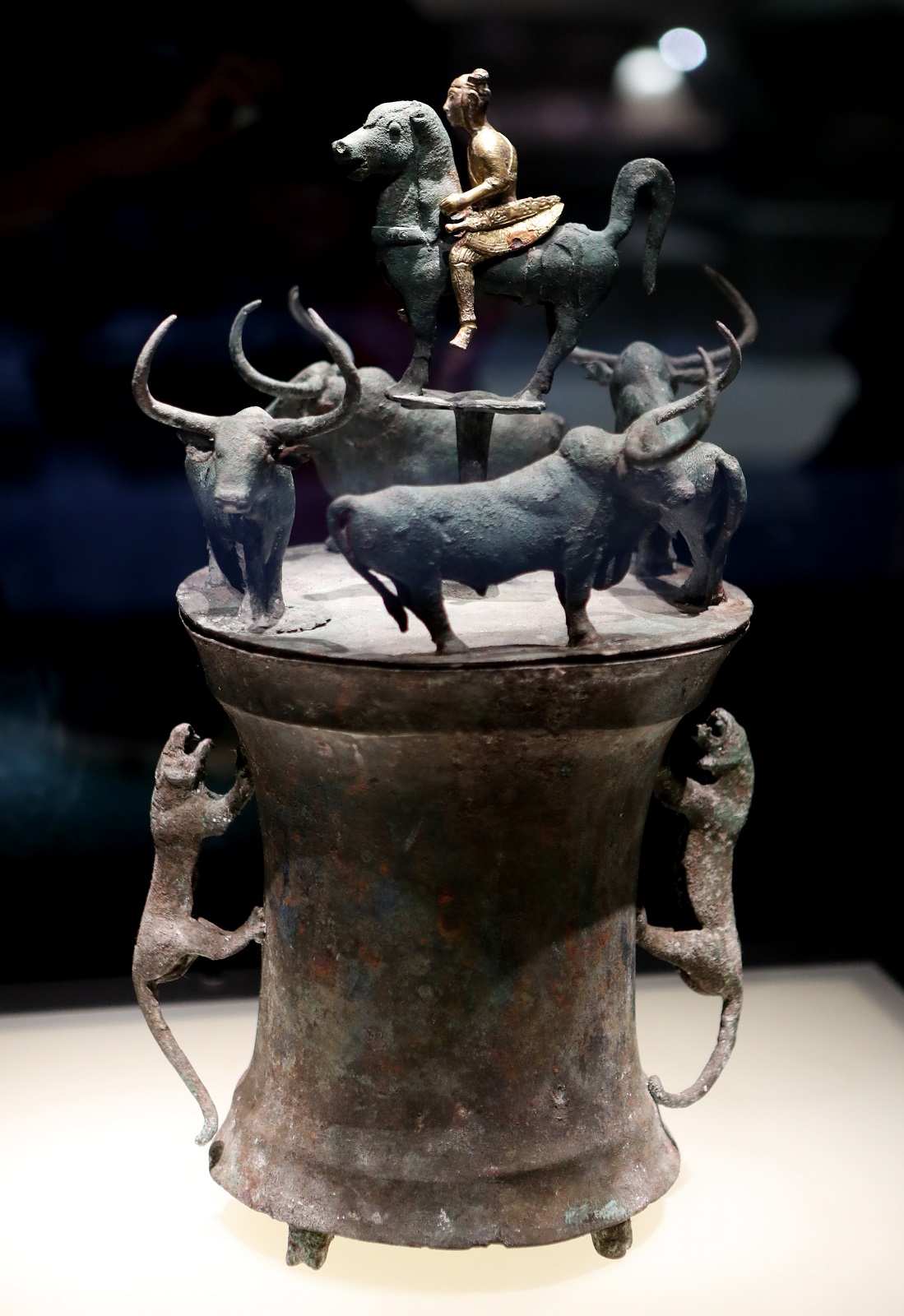 The bronze shell container with a lid decorated by four bulls and a gilded horse rider on top is in the permanent collection of the Yunnan Provincial Museum. [Photo/IC]