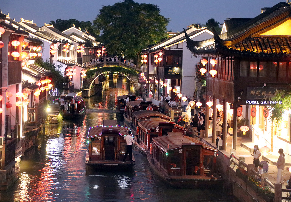 Tourists visit the Shantang Street and ride a boat at night. [Photo/VCG]