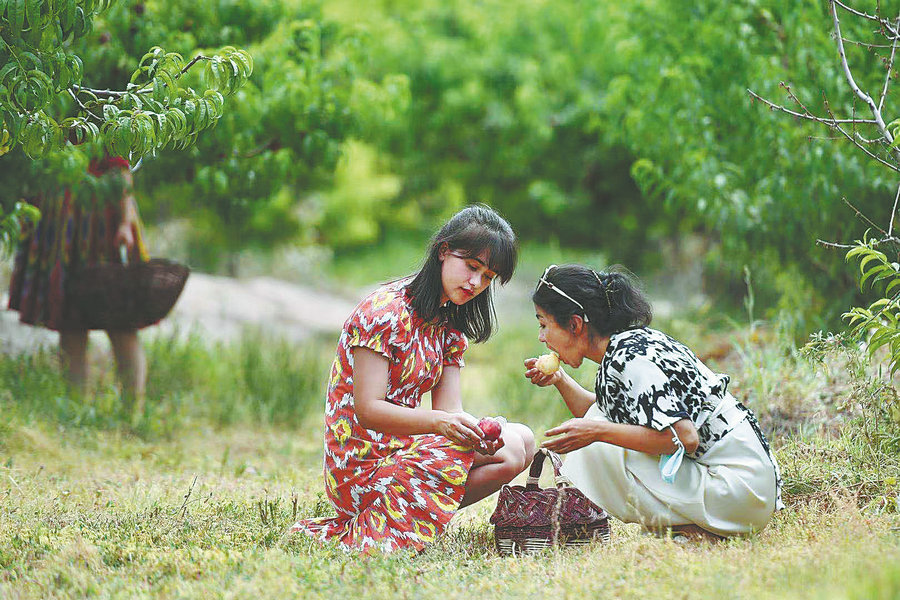 Tourists pick and appreciate peaches in a fruit farm along the highway. [Photo by Wei Xiaohao/China Daily]