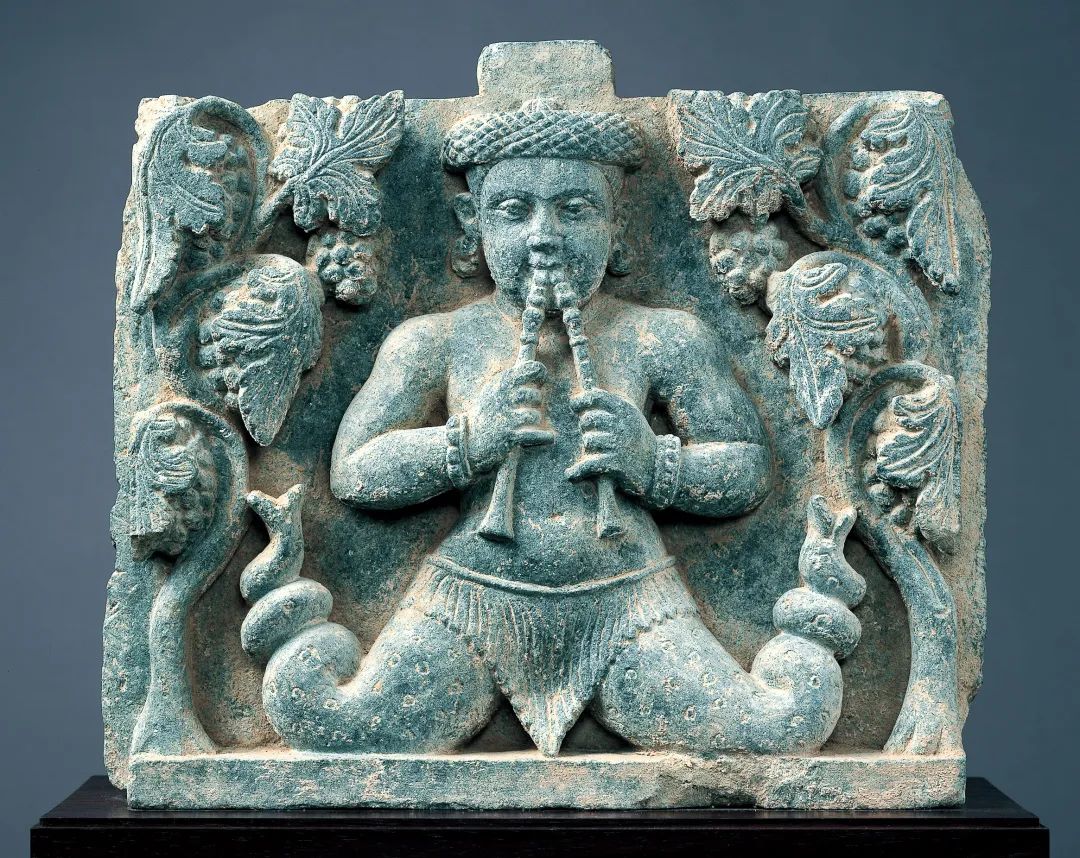 Relief that depicts Triton playing two flutes, Gandhara, 1st-3rd centuries [Photo/Official WeChat account of the Museum of Wu]
