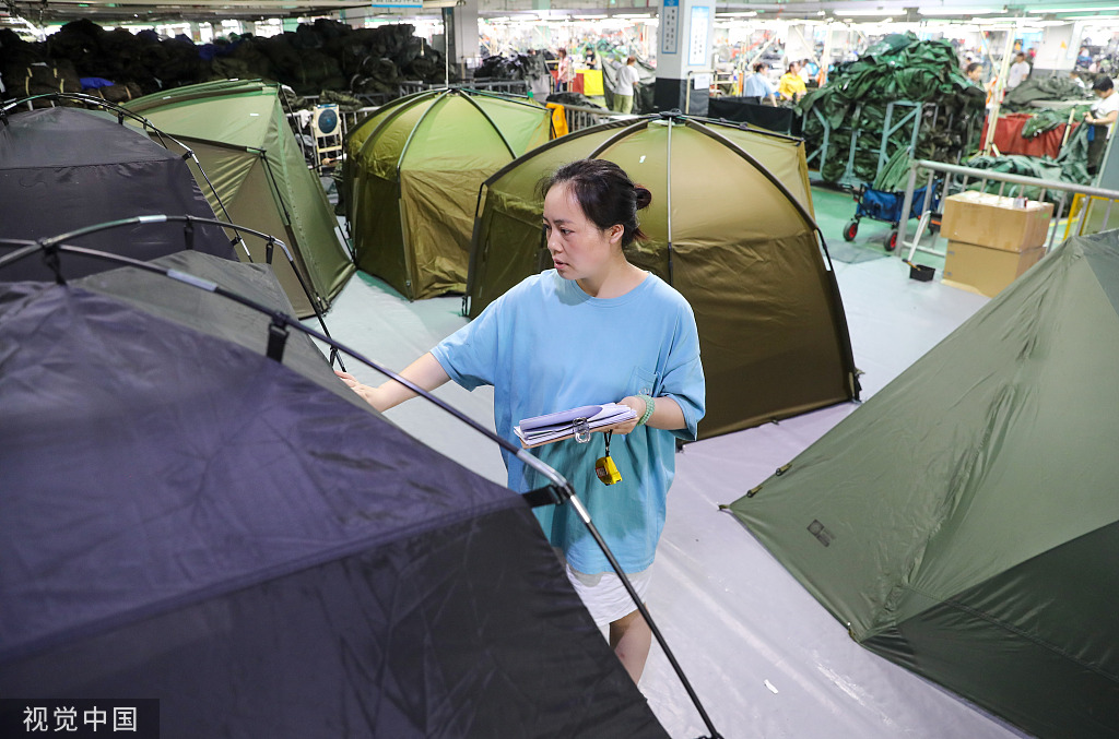 A woman checks tents in the factory of Zhejiang Hengfeng Top Leisure Co Ltd in Huzhou, Zhejiang province on June 20, 2022. [Photo/VCG]
