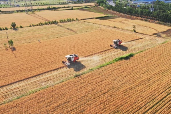 Farmers harvest wheat in the fields of Shaozhuang village in Weifang, Shandong province on Monday. [Photo by Li Hongsen/For chinadaily.com.cn]