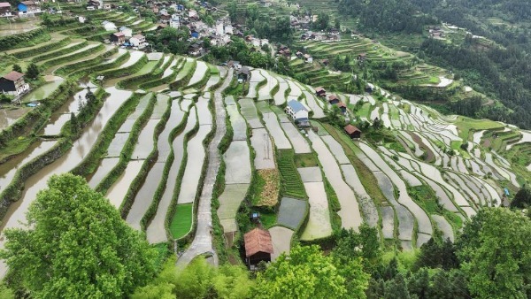 Rice paddies filled with water are ready for seedlings in Bayi Miao village in Jinping county, Qiandongnan Miao and Dong autonomous prefecture in Guizhou province. [Photo by Yang Xiaohai/For chinadaily.com.cn]