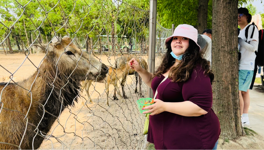 Armendariz Caitlin from the US feeds an elk with carrots at the Dafeng National Level Elk Nature Reserve on June 26. [Photo by Xue Miao/chinadaily.com.cn]