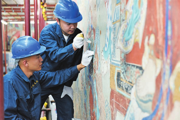 Technicians restore a mural in Yunlin Temple in Datong city, Shanxi province. [Photo/Datong Daily]