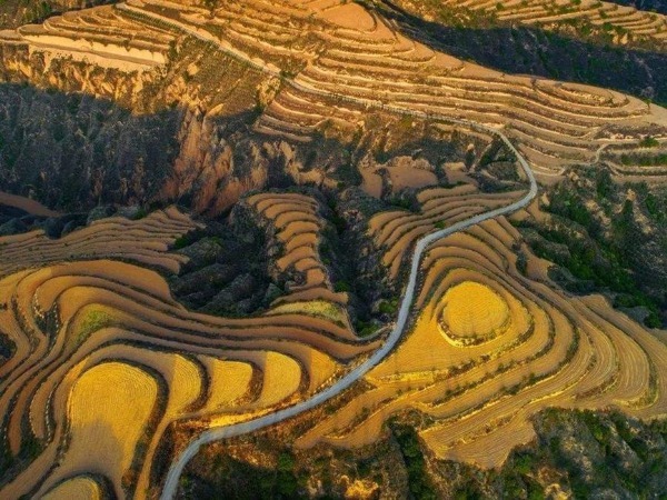 An aerial photo shows the terraced fields in an agricultural park in Yonghe county, Shanxi province. [Photo provided to chinadaily.com.cn]