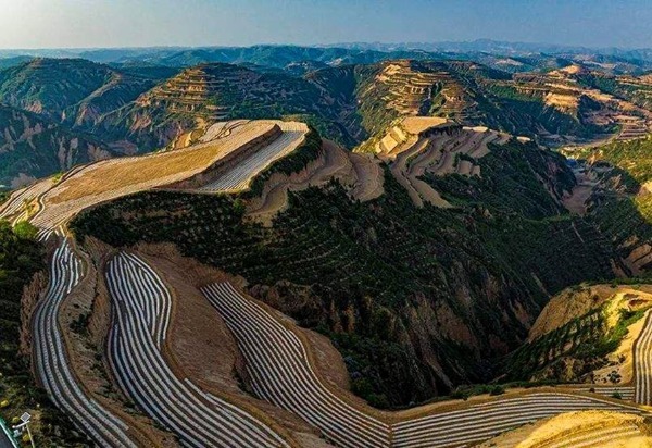 An aerial photo shows the terraced fields in an agricultural park in Yonghe county, Shanxi province. [Photo provided to chinadaily.com.cn]