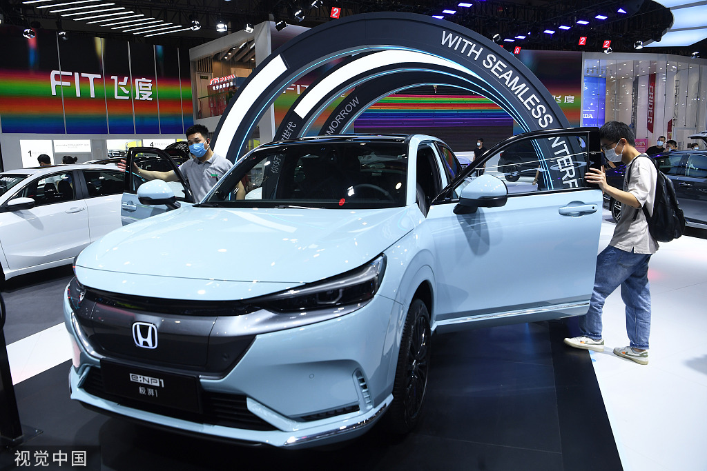 A visitor looks at a Honda e: NP1 model at the 2022 Chongqing International Auto Exhibition in Southwest China's Chongqing municipality. [Photo/VCG]