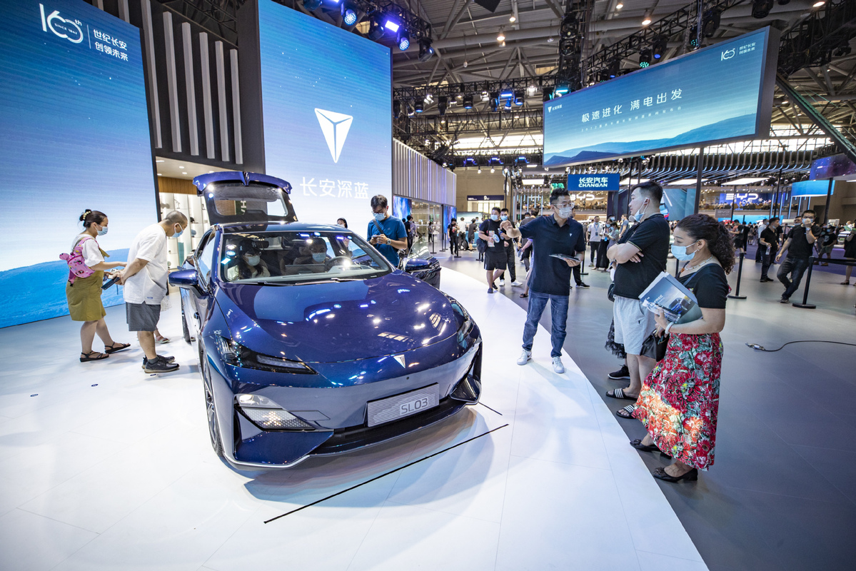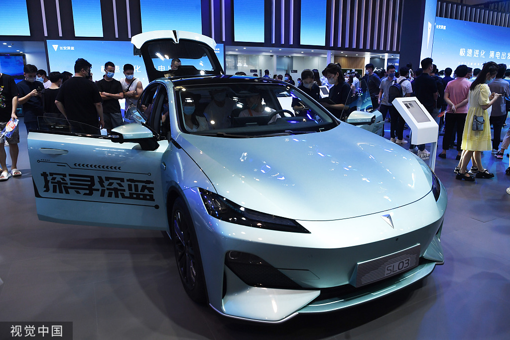A Changan Deep Blue new energy vehicle on display at the 2022 Chongqing International Auto Exhibition in Southwest China's Chongqing municipality. [Photo/VCG]