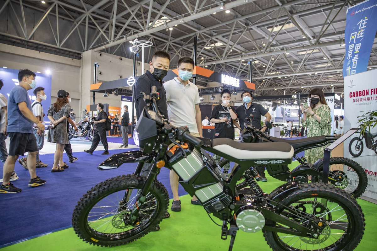A staff member introduces an electric off-road motorcycle made of ultra-light carbon fiber materials during the 2022 Chongqing International Auto Exhibition in Southwest China's Chongqing municipality. [Photo/Xinhua]