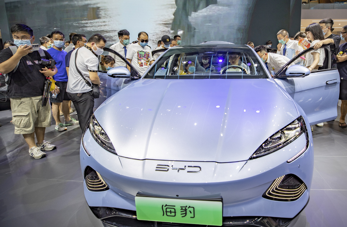 Visitors view a new energy vehicle during the 2022 Chongqing International Auto Exhibition in Southwest China's Chongqing municipality. [Photo/Xinhua]