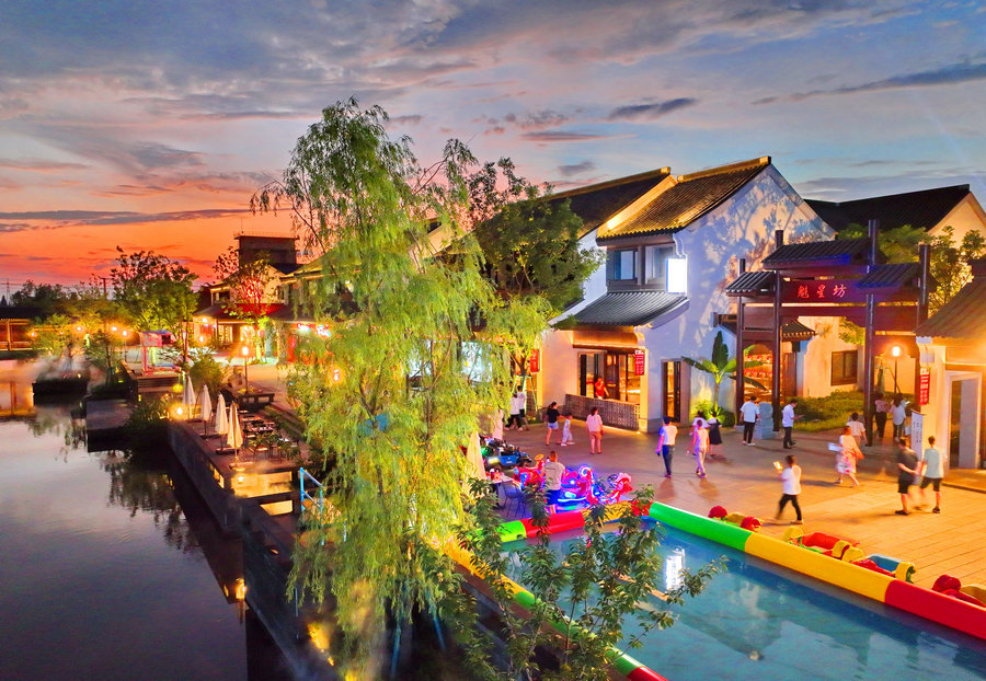 Liuxiban Street, the first phase of Zhang Jian Culture Town in Changle town of Nantong, East China's Jiangsu province, sparkles at night on June 28. Tourists and guests were out to enjoy a stunning light show and explore the intangible cultural heritage items located there.