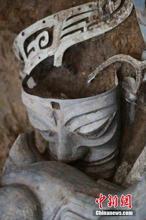 A bronze head sculpture is found at the No 8 sacrificial pit of Sanxingdui site in Guanghan, Sichuan province, on June 28, 2022. [Photo/Chinanew.com]