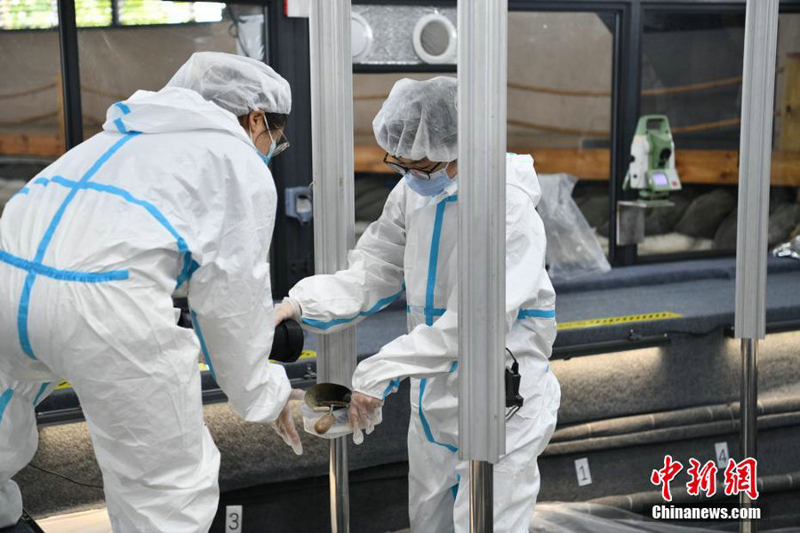 Archaeologists work at the No 8 sacrificial pit of Sanxingdui site in Guanghan, Sichuan province, on June 28, 2022. [Photo/Chinanew.com]