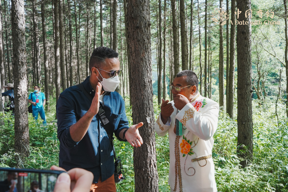 A member of the "A Date with China" 2022 international media tour talks with a local person in the Liupan Mountain National Forest Park in Northwest China's Ningxia Hui autonomous region on June 28. [Photo provided to chinadaily.com.cn]