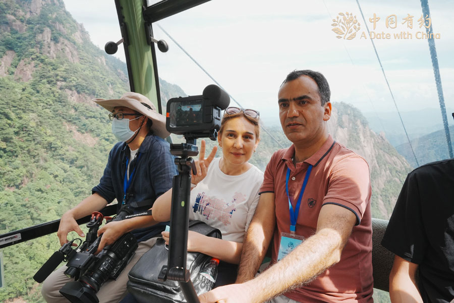 Members of "A date with China" international media tour take group photos during a visit to Huangshan Mountain in East China's Anhui province, July 1, 2022. [Photo/chinadaily.com.cn]