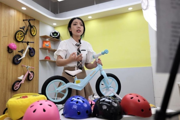 A host introduces small bicycles for children in a livestream from an e-commerce base in Pingxiang county of Xingtai, Hebei province. [Photo provided to chinadaily.com.cn]