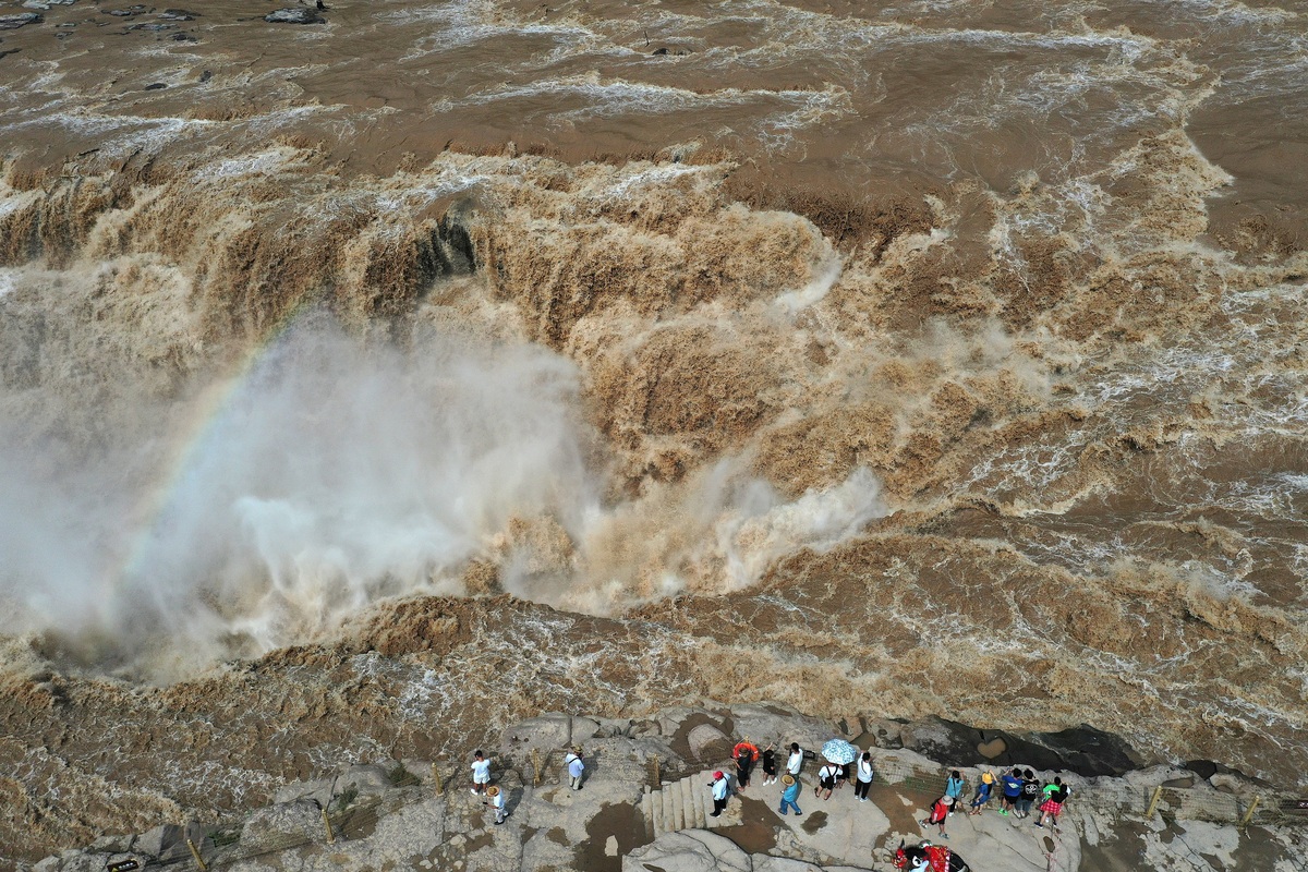 Tourists visit the Hukou Waterfall on the Yellow River in Jixian county of Shanxi province, July 4, 2022. [Photo by Lyu Guiming/For chinadaily.com.cn]